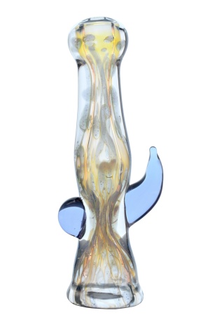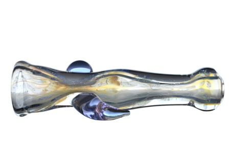 Jason at Proton glass has brought us another beautiful 3.75" Chillum in a stunning silver fumed pattern, encased in a clear overlay, embellished with a transparent purple tinted horn and glass bead along the sides across one another.